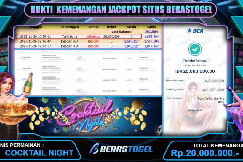 COCKTAIL NIGHTS AUTO CUAN – Kami ucapkan selamat atas kemenangan member Berastogel dengan ID : RUS**** di game COCKTAIL NIGHT sebesar Rp 15.000.000. Terima kasih sudah mempercayakan kami sebagai BO…